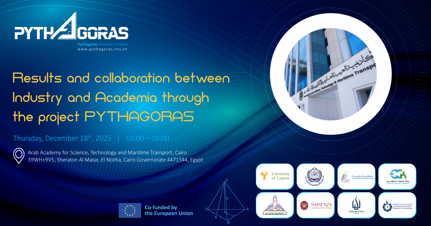 On the occasion of the closing ceremony of the Erasmus+ PYTHAGORAS project, which will be held on December 17 and 18, 2025, in Cairo, a conference entitled “Results and Collaboration between Industry and Academia through the PYTHAGORAS Project” will take place on Thursday, December 18, from 10:00 AM to 4:00 PM at the Arab Academy for Science, Technology and Maritime Transport, Cairo 39WH+9V5, Sheraton Al Matar, El Nozha, Cairo Governorate 4471344, Egypt.